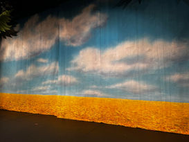 Made of muslin fabric; this drop was secured from Theatre World Backdrops. OFC has adjusted this drop to be cut into two pieces and travel on curtain tracks. This drop also has been cut down from 18' to 13', approximately like pictured. Each side is roughly 20' wide by 13' high; totaling 40' stage coverage, grommets & ties along top of drop